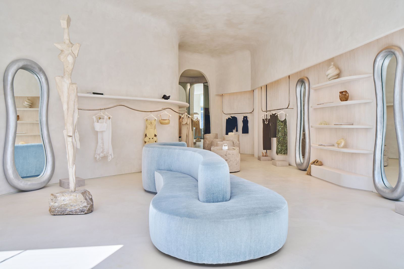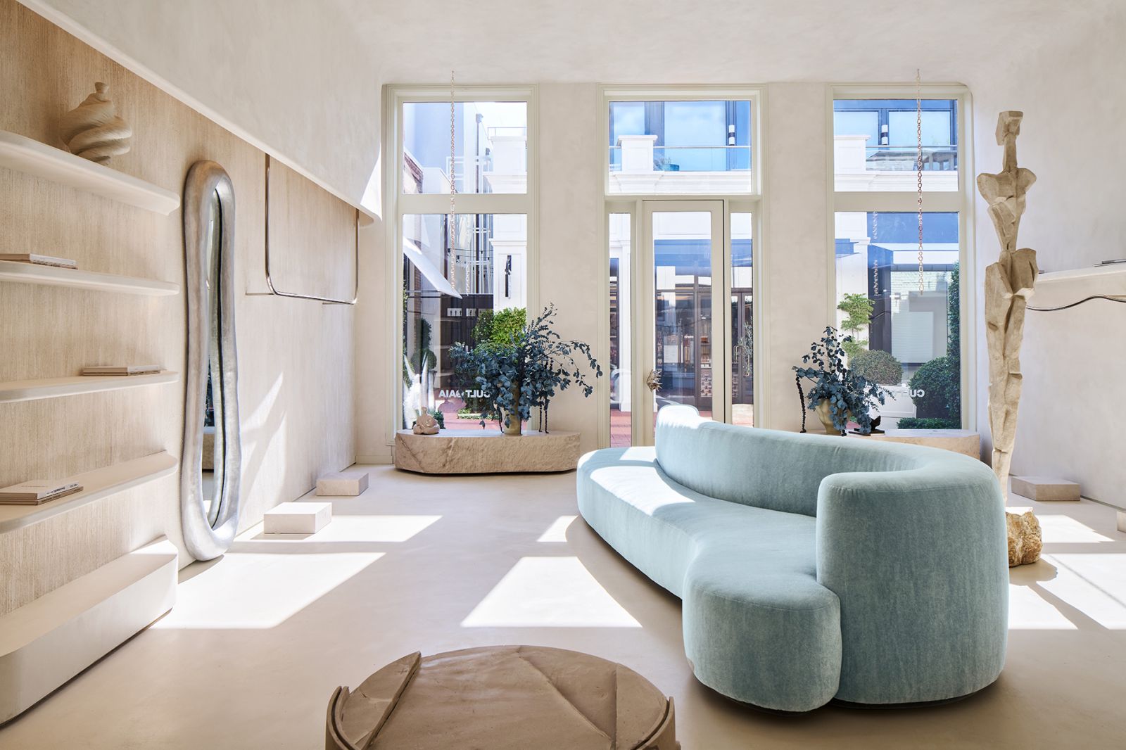 For the Palisades Village location, the design evolved in response to its coastal context, resulting in stone furniture with softer curves, organic forms, textured finishes, and a lighter color palette.