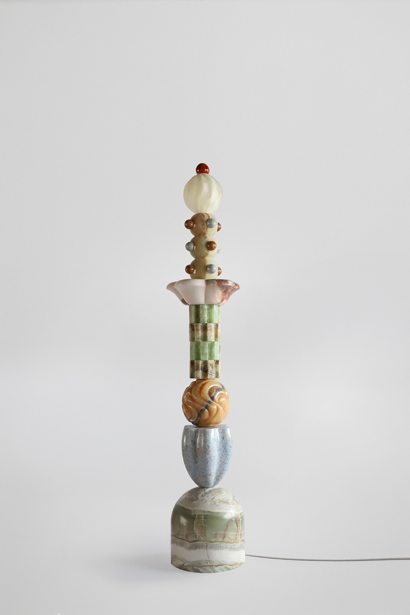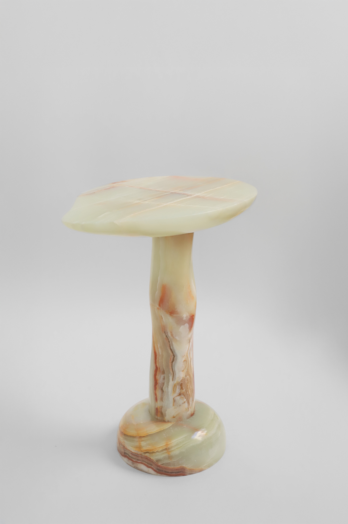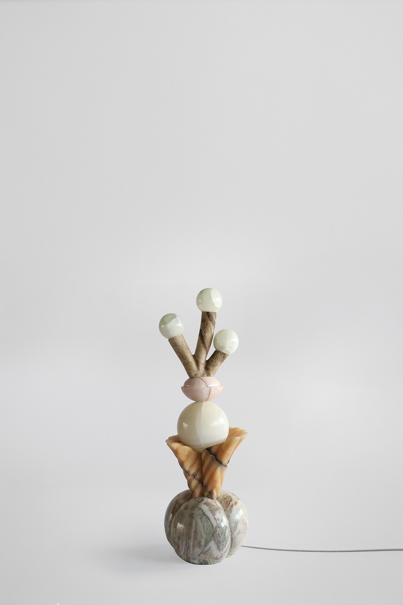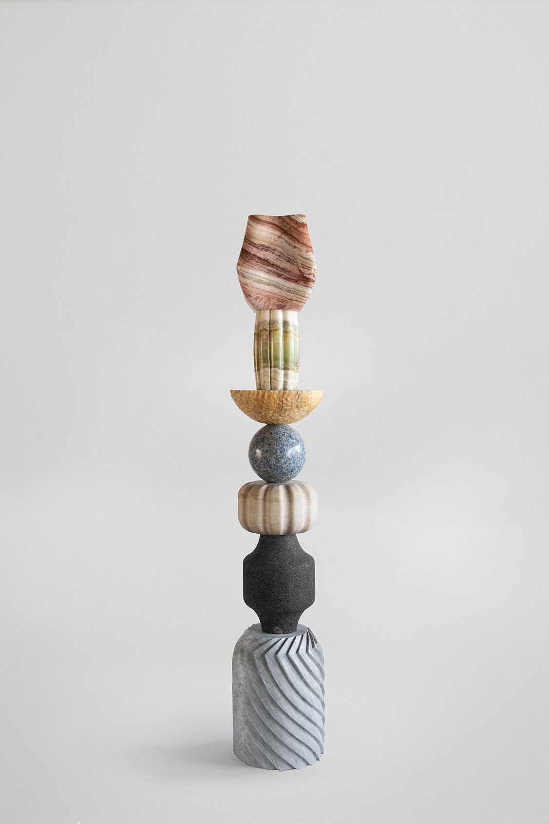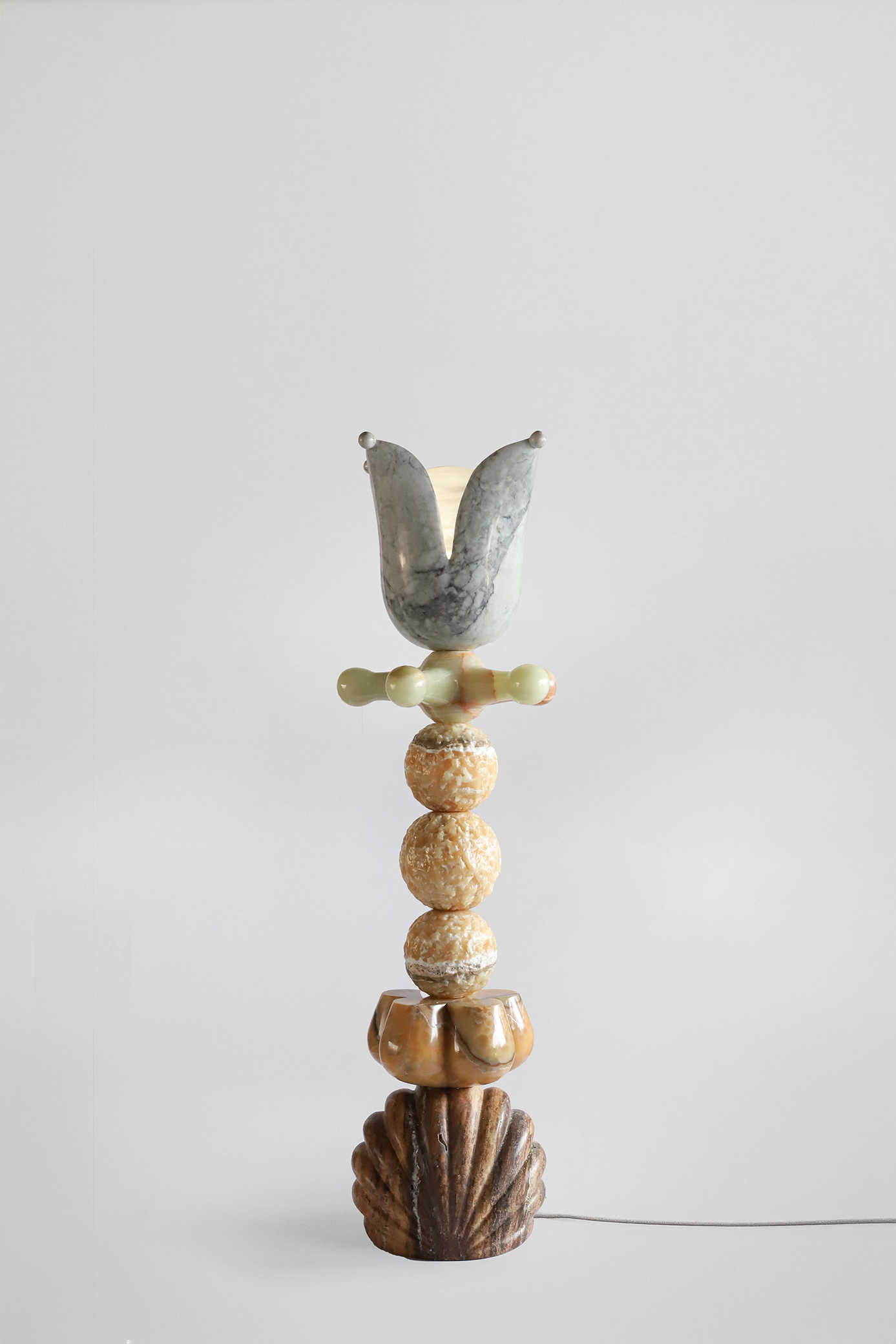 At the heart of this landscape stands Florea, a modular composition consisting of a centerpiece, two stools, and two auxiliary tables, mirroring the organic asymmetry of anemones, peonies, and clover leaves—an altar of floral harmony captured in stone. Surrounding it, seven lithic sentinels rise, creating a journey through the rich botanical diversity of the world. Three of them function as floor lamps, while another serves as a scent diffuser, enhancing the immersive experience. Each sentinel embodies the essence of a unique ecosystem, celebrating the intricate relationships between plants and the landscapes they inhabit.