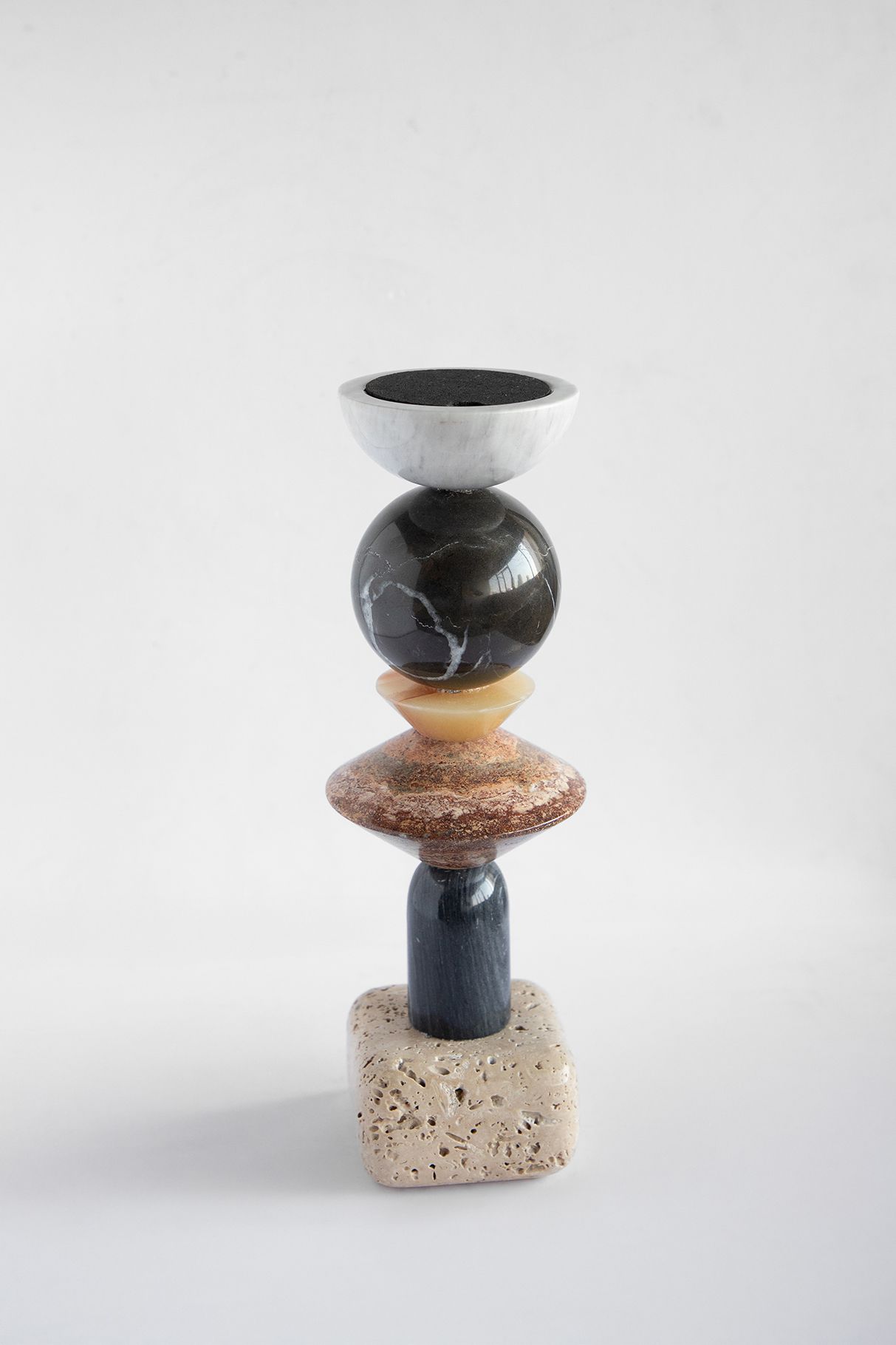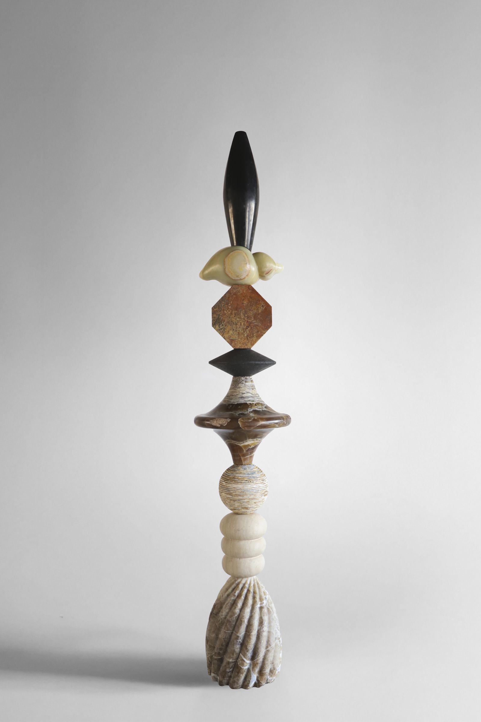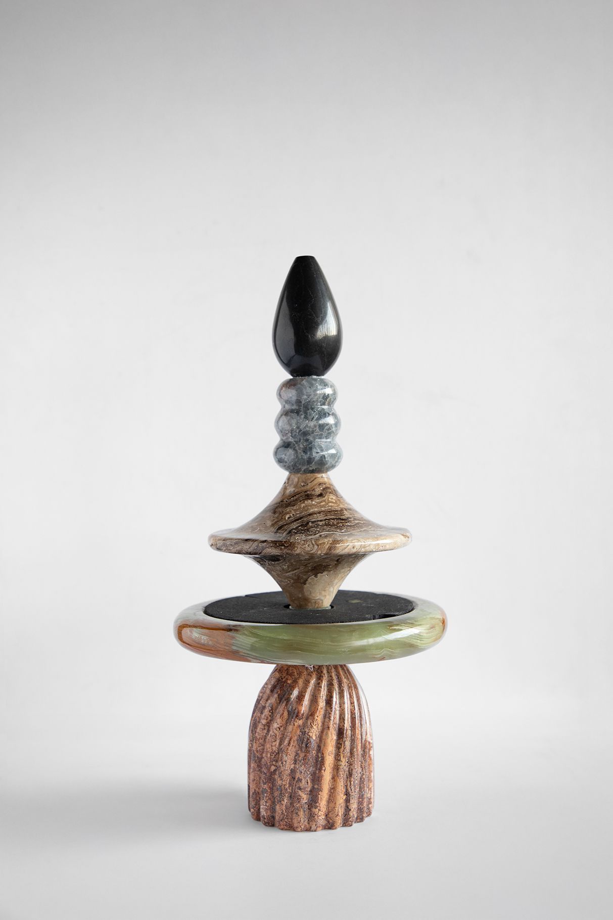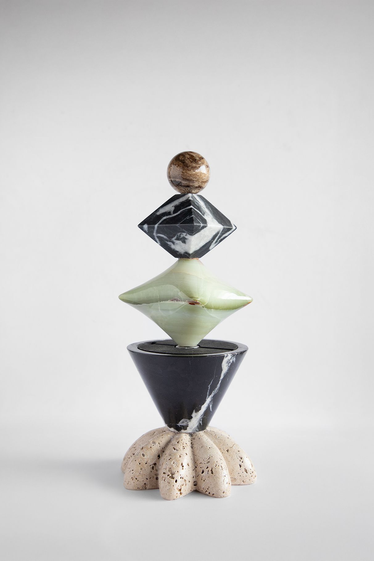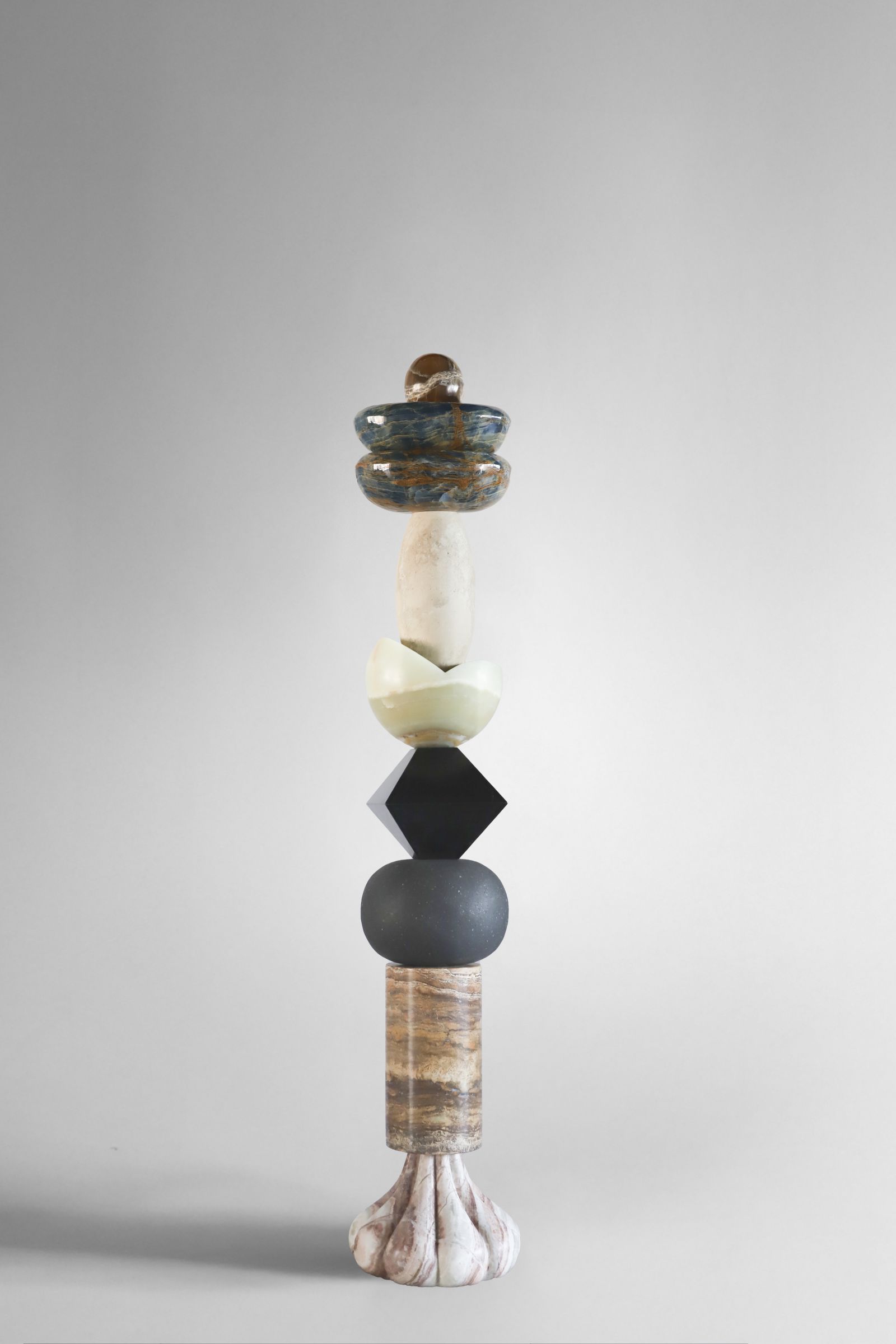 The collection is composed of three totemic sculptures, Whispers of Halfeti of varying heights, conceived to exist in dialogue with one another, with scent, and with the emotions it evokes. Their vertical presence, layered stones, and rhythmic compositions echo ideas of travel, grounding, and transformation inherent to Halfeti.